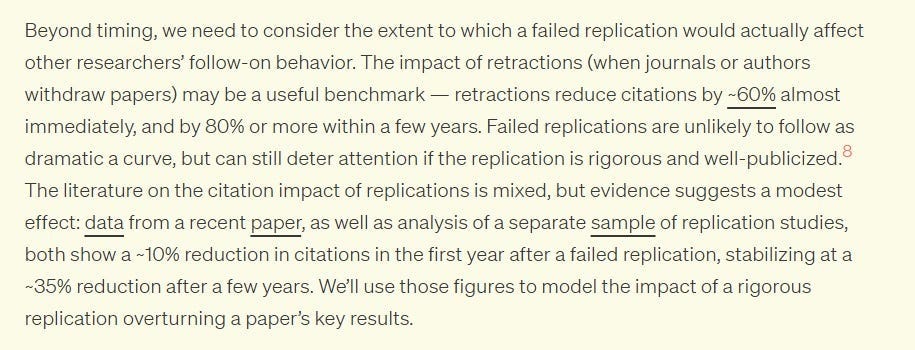 On your last point about not treating community response as static, we’re in agreement. The model treats the reduction in citations as a fixed parameter mostly because that’s the ecosystem that any new replication program will exist within, and we should be clear-eyed about the impact those replications will or will not have.