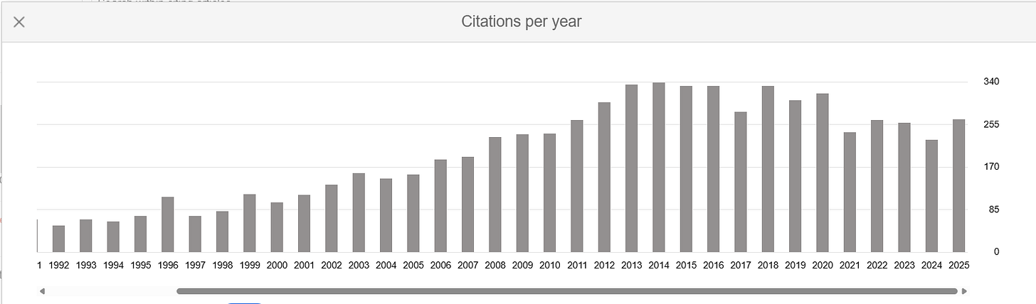The famous 2006 Alzheimer’s paper that turned out to be likely fraudulent was cited over 3,600 times according to Google Scholar. 414 of those citations occurred since 2021, starting 15 years after the paper was published. Here’s the historical pattern (and keep in mind that mid-2022 was when the potential fraud was uncovered):