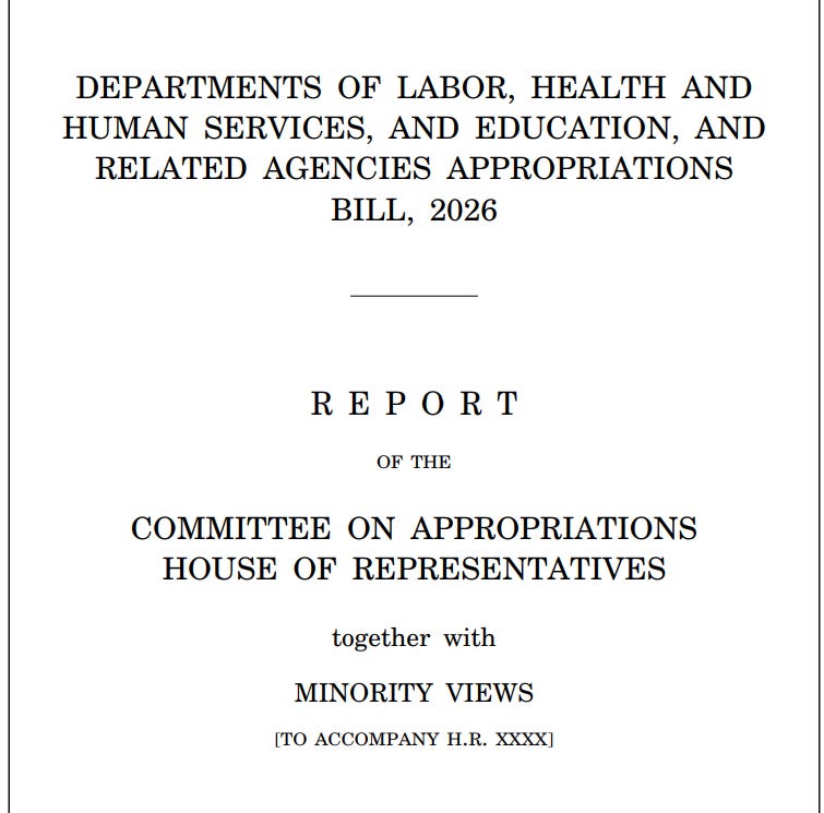 Earlier this week, the House’s Appropriations Subcommittee for Labor-HHS released a 379-page report accompanying the budget. I read (ok, skimmed) through the whole thing, and wanted to point out several items of interest.