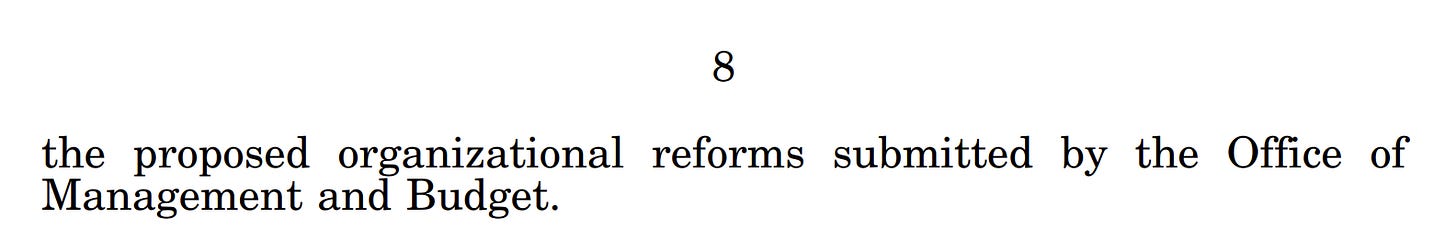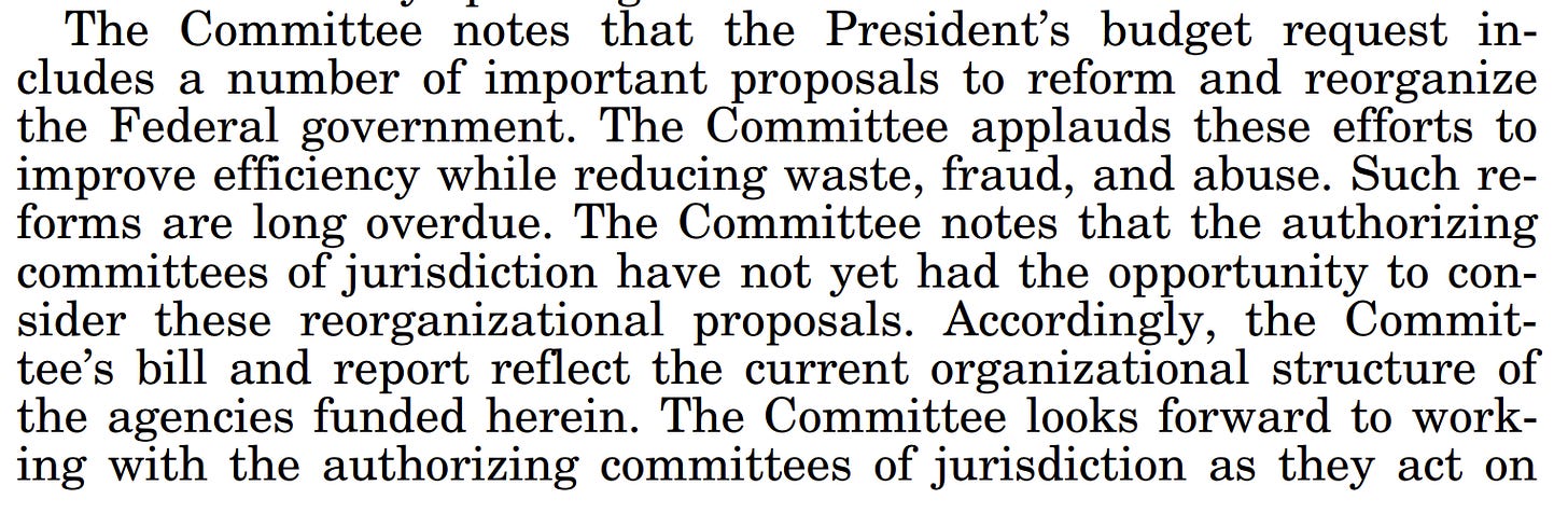 First, there’s a subtle dig at the White House for proposing to reorganize various federal agencies without going to the right Congressional committees: