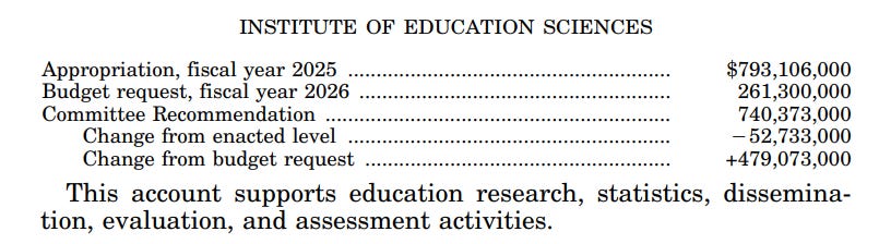 As for the Institute of Education Sciences (the main office that fundseducation RCTs and that collects education statistics across the country), the administration had asked for a mere $261 million, but the committee is recommending $740 million (with “only” a cut of $52.7 million). If all goes well, we might be able to keep some semblance of education research and statistics going in this country.