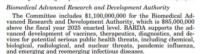 Seventh, despite an apparent attempt to minimize or get rid of BARDA, the House is increasing funding from 2025 levels: