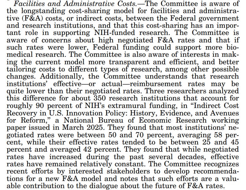 Sixth, as for indirect costs, the House not only praises recent efforts at reform, but acknowledges a recent working paper from Pierre Azoulay, Daniel Gross, and Bhaven Sampat on the true rate of indirect costs (rather than the sticker price). Nice work!